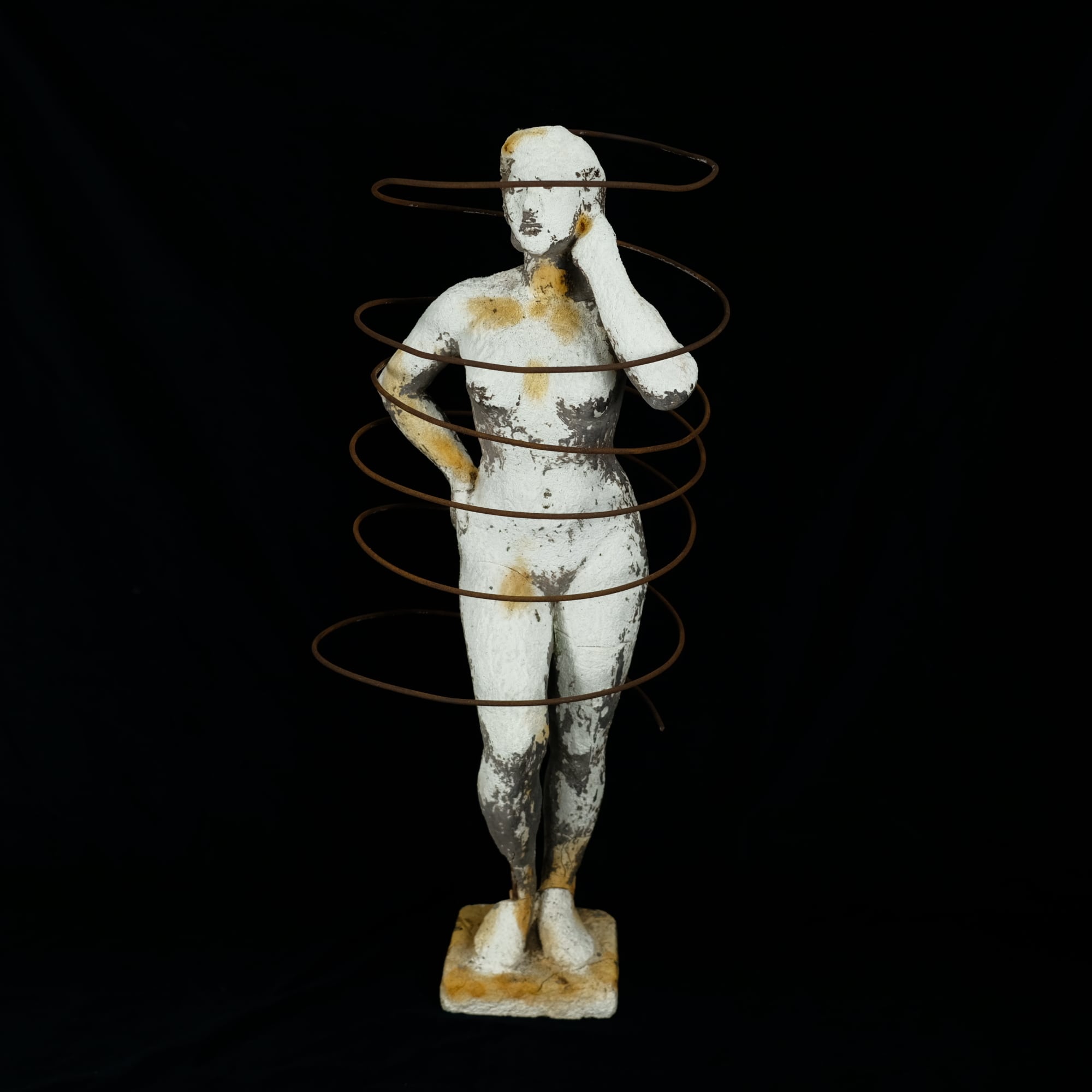 古い女性の彫刻に、錆びた鉄線を組み合わせたオブジェです。
